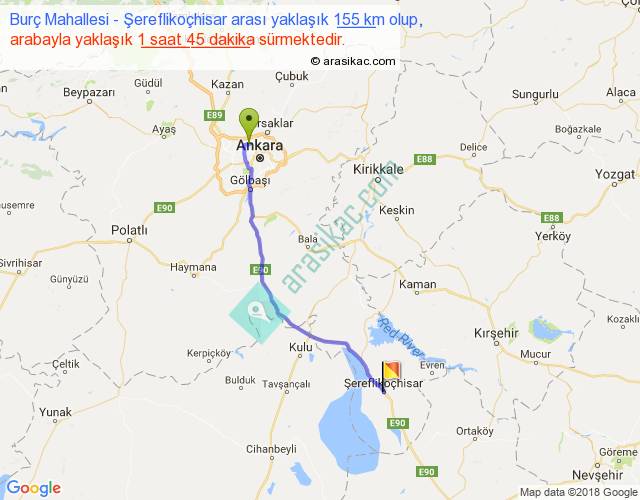 Burç Mahallesi - Şereflikoçhisar arası yaklaşık olarak 90 km/h ile yukarıda belirtilen sürede olup, iki yerin kuş uçuşu uzaklığı (mesafesi) 132'dir. Yolculuk otobüsle 2 saat 16 dakika sürmektedir.