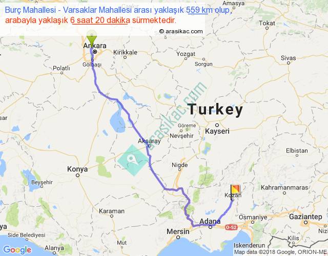 Burç Mahallesi - Varsaklar Mahallesi arası yaklaşık olarak 90 km/h ile yukarıda belirtilen sürede olup, iki yerin kuş uçuşu uzaklığı (mesafesi) 382'dir. Eğer belirtilen yerler arasında uçak seferi var ise bu süre uçakla 35 dakika'ya kadar düşebilir. Yolculuk otobüsle 8 saat 14 dakika sürmektedir.