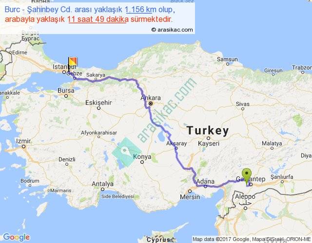 Burc - Şahinbey Cd. arası yaklaşık olarak 90 km/h ile yukarıda belirtilen sürede olup, iki yerin kuş uçuşu uzaklığı (mesafesi) 818'dir. Eğer belirtilen yerler arasında uçak seferi var ise bu süre uçakla 1 saat 15 dakika'ya kadar düşebilir. Yolculuk otobüsle 15 saat 21 dakika sürmektedir.