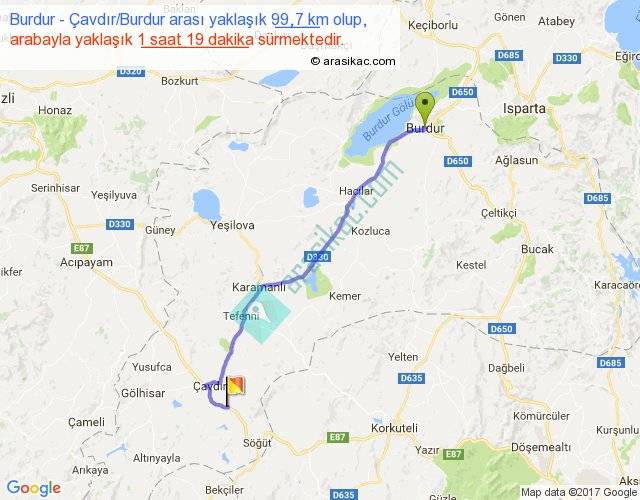 Burdur - Çavdır Burdur arası yaklaşık olarak 90 km/h ile yukarıda belirtilen sürede olup, iki yerin kuş uçuşu uzaklığı (mesafesi) 82'dir. Yolculuk otobüsle 1 saat 42 dakika sürmektedir.