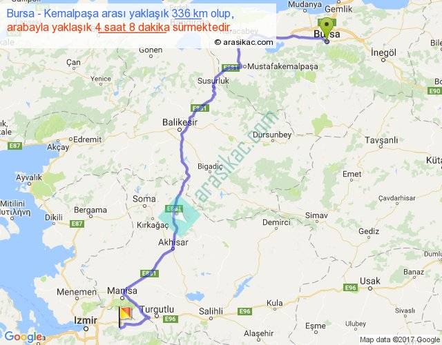 Bursa - Kemalpaşa arası yaklaşık olarak 90 km/h ile yukarıda belirtilen sürede olup, iki yerin kuş uçuşu uzaklığı (mesafesi) 240'dir. Yolculuk otobüsle 5 saat 22 dakika sürmektedir.