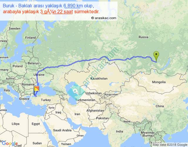 Buruk - Baklalı arası yaklaşık olarak 90 km/h ile yukarıda belirtilen sürede olup, iki yerin kuş uçuşu uzaklığı (mesafesi) 5339'dir. Eğer belirtilen yerler arasında uçak seferi var ise bu süre uçakla 8 saat 12 dakika'ya kadar düşebilir. Yolculuk otobüsle 5 gün 2 saat sürmektedir.
