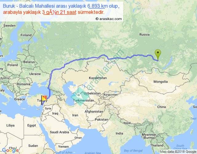 Buruk - Balcalı Mahallesi arası yaklaşık olarak 90 km/h ile yukarıda belirtilen sürede olup, iki yerin kuş uçuşu uzaklığı (mesafesi) 5233'dir. Eğer belirtilen yerler arasında uçak seferi var ise bu süre uçakla 8 saat 03 dakika'ya kadar düşebilir. Yolculuk otobüsle 5 gün 0 saat sürmektedir.