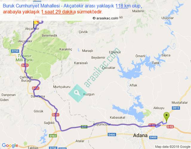 Buruk Cumhuriyet Mahallesi - Akçatekir arası yaklaşık olarak 90 km/h ile yukarıda belirtilen sürede olup, iki yerin kuş uçuşu uzaklığı (mesafesi) 66'dir. Yolculuk otobüsle 1 saat 55 dakika sürmektedir.