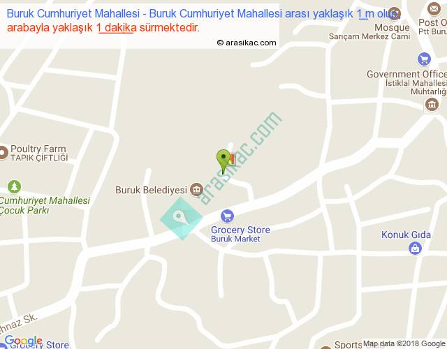 Buruk Cumhuriyet Mahallesi - Buruk Cumhuriyet Mahallesi arası yaklaşık olarak 90 km/h ile yukarıda belirtilen sürede olup, iki yerin kuş uçuşu uzaklığı (mesafesi) 0'dir. Yolculuk otobüsle 1 dakika sürmektedir.