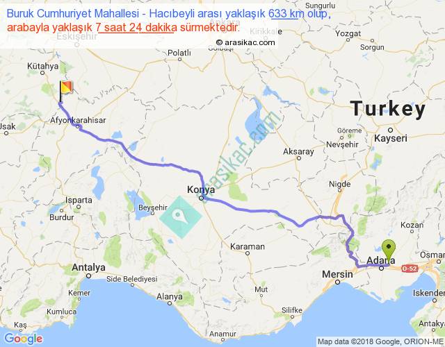 Buruk Cumhuriyet Mahallesi - Hacıbeyli arası yaklaşık olarak 90 km/h ile yukarıda belirtilen sürede olup, iki yerin kuş uçuşu uzaklığı (mesafesi) 502'dir. Eğer belirtilen yerler arasında uçak seferi var ise bu süre uçakla 46 dakika'ya kadar düşebilir. Yolculuk otobüsle 9 saat 37 dakika sürmektedir.
