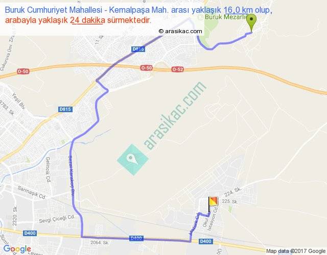 Buruk Cumhuriyet Mahallesi - Kemalpaşa Mah. arası yaklaşık olarak 90 km/h ile yukarıda belirtilen sürede olup, iki yerin kuş uçuşu uzaklığı (mesafesi) 5'dir. Yolculuk otobüsle 31 dakika sürmektedir.