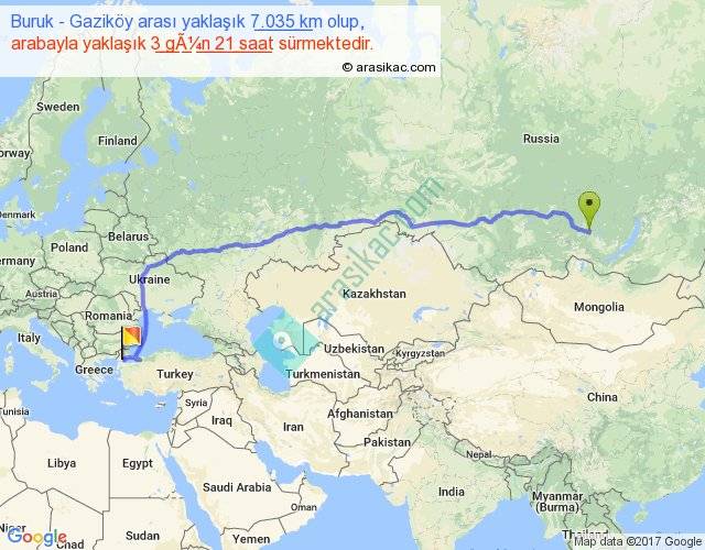 Buruk - Gaziköy arası yaklaşık olarak 90 km/h ile yukarıda belirtilen sürede olup, iki yerin kuş uçuşu uzaklığı (mesafesi) 5459'dir. Eğer belirtilen yerler arasında uçak seferi var ise bu süre uçakla 8 saat 23 dakika'ya kadar düşebilir. Yolculuk otobüsle 5 gün 0 saat sürmektedir.