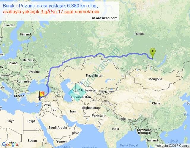 Buruk - Pozantı arası yaklaşık olarak 90 km/h ile yukarıda belirtilen sürede olup, iki yerin kuş uçuşu uzaklığı (mesafesi) 5236'dir. Eğer belirtilen yerler arasında uçak seferi var ise bu süre uçakla 8 saat 03 dakika'ya kadar düşebilir. Yolculuk otobüsle 4 gün 19 saat sürmektedir.