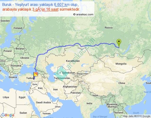 Buruk - Yeşilyurt arası yaklaşık olarak 90 km/h ile yukarıda belirtilen sürede olup, iki yerin kuş uçuşu uzaklığı (mesafesi) 4955'dir. Eğer belirtilen yerler arasında uçak seferi var ise bu süre uçakla 7 saat 37 dakika'ya kadar düşebilir. Yolculuk otobüsle 4 gün 18 saat sürmektedir.