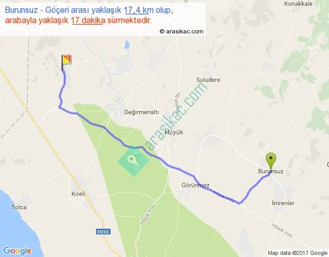 Burunsuz - Göçeri arası yaklaşık olarak 90 km/h ile yukarıda belirtilen sürede olup, iki yerin kuş uçuşu uzaklığı (mesafesi) 13'dir. Yolculuk otobüsle 22 dakika sürmektedir.