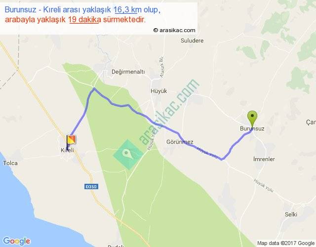 Burunsuz - Kıreli arası yaklaşık olarak 90 km/h ile yukarıda belirtilen sürede olup, iki yerin kuş uçuşu uzaklığı (mesafesi) 11'dir. Yolculuk otobüsle 24 dakika sürmektedir.