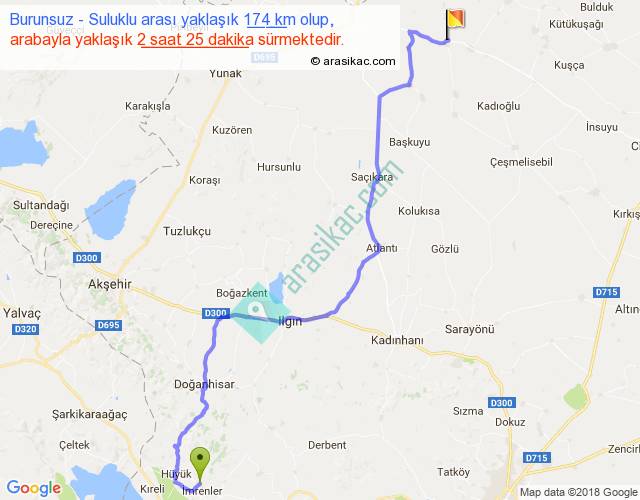Burunsuz - Suluklu arası yaklaşık olarak 90 km/h ile yukarıda belirtilen sürede olup, iki yerin kuş uçuşu uzaklığı (mesafesi) 121'dir. Yolculuk otobüsle 3 saat 8 dakika sürmektedir.