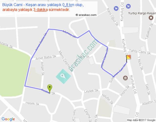 Büyük Cami - Keşan arası yaklaşık olarak 90 km/h ile yukarıda belirtilen sürede olup, iki yerin kuş uçuşu uzaklığı (mesafesi) 0'dir. Yolculuk otobüsle 3 dakika sürmektedir.