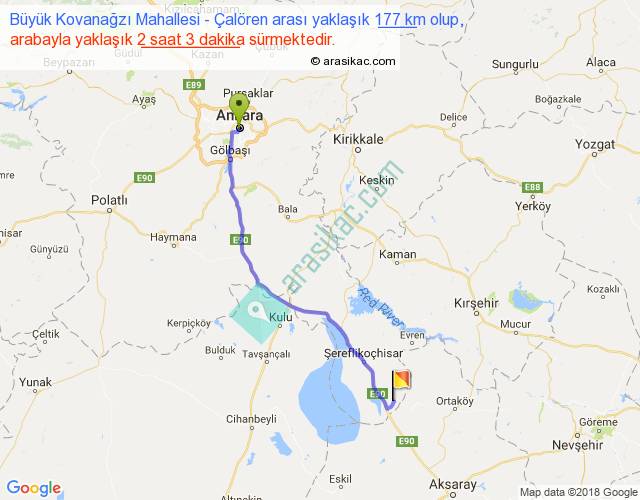 Büyük Kovanağzı Mahallesi - Çalören arası yaklaşık olarak 90 km/h ile yukarıda belirtilen sürede olup, iki yerin kuş uçuşu uzaklığı (mesafesi) 147'dir. Yolculuk otobüsle 2 saat 39 dakika sürmektedir.