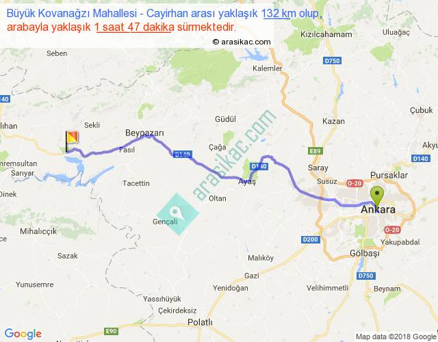 Büyük Kovanağzı Mahallesi - Cayirhan arası yaklaşık olarak 90 km/h ile yukarıda belirtilen sürede olup, iki yerin kuş uçuşu uzaklığı (mesafesi) 107'dir. Yolculuk otobüsle 2 saat 19 dakika sürmektedir.