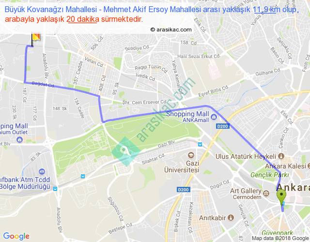Büyük Kovanağzı Mahallesi - Mehmet Akif Ersoy Mahallesi arası yaklaşık olarak 90 km/h ile yukarıda belirtilen sürede olup, iki yerin kuş uçuşu uzaklığı (mesafesi) 9'dir. Yolculuk otobüsle 26 dakika sürmektedir.