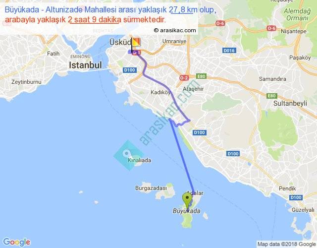 Büyükada - Altunizade Mahallesi arası yaklaşık olarak 90 km/h ile yukarıda belirtilen sürede olup, iki yerin kuş uçuşu uzaklığı (mesafesi) 19'dir. Yolculuk otobüsle 2 saat 47 dakika sürmektedir.