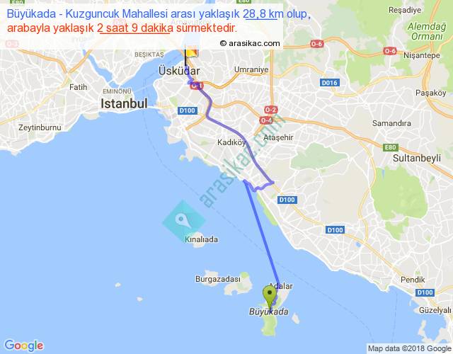 Büyükada - Kuzguncuk Mahallesi arası yaklaşık olarak 90 km/h ile yukarıda belirtilen sürede olup, iki yerin kuş uçuşu uzaklığı (mesafesi) 21'dir. Yolculuk otobüsle 2 saat 47 dakika sürmektedir.