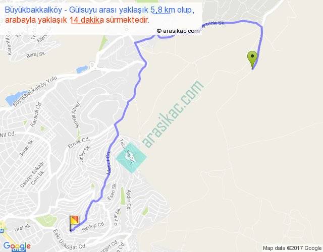 Büyükbakkalköy - Gülsuyu arası yaklaşık olarak 90 km/h ile yukarıda belirtilen sürede olup, iki yerin kuş uçuşu uzaklığı (mesafesi) 3'dir. Yolculuk otobüsle 18 dakika sürmektedir.