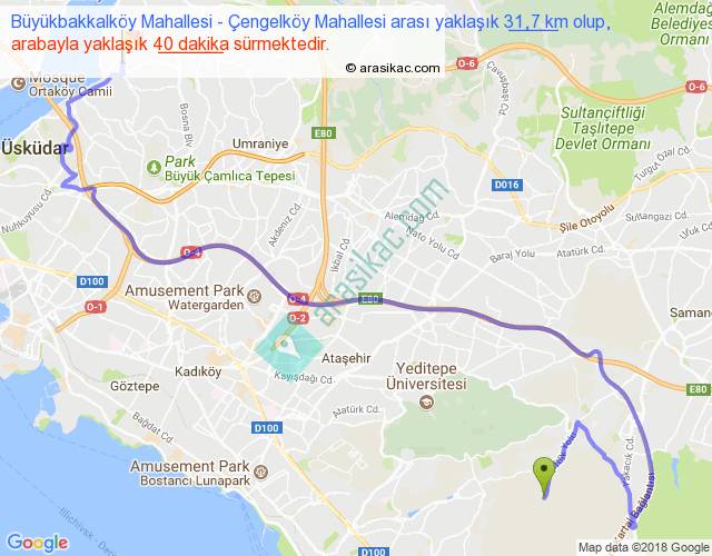 Büyükbakkalköy Mahallesi - Çengelköy Mahallesi arası yaklaşık olarak 90 km/h ile yukarıda belirtilen sürede olup, iki yerin kuş uçuşu uzaklığı (mesafesi) 16'dir. Yolculuk otobüsle 52 dakika sürmektedir.