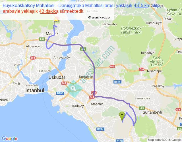 Büyükbakkalköy Mahallesi - Darüşşafaka Mahallesi arası yaklaşık olarak 90 km/h ile yukarıda belirtilen sürede olup, iki yerin kuş uçuşu uzaklığı (mesafesi) 24'dir. Yolculuk otobüsle 55 dakika sürmektedir.