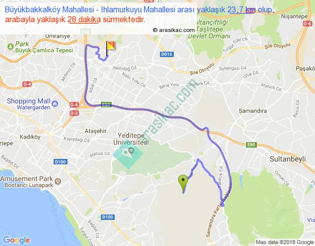 Büyükbakkalköy Mahallesi - Ihlamurkuyu Mahallesi arası yaklaşık olarak 90 km/h ile yukarıda belirtilen sürede olup, iki yerin kuş uçuşu uzaklığı (mesafesi) 9'dir. Yolculuk otobüsle 36 dakika sürmektedir.