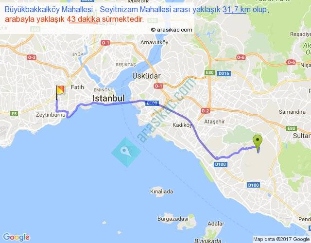 Büyükbakkalköy Mahallesi - Seyitnizam Mahallesi arası yaklaşık olarak 90 km/h ile yukarıda belirtilen sürede olup, iki yerin kuş uçuşu uzaklığı (mesafesi) 24'dir. Yolculuk otobüsle 55 dakika sürmektedir.