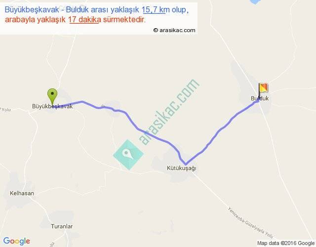 Büyükbeşkavak - Bulduk arası yaklaşık olarak 90 km/h ile yukarıda belirtilen sürede olup, iki yerin kuş uçuşu uzaklığı (mesafesi) 12'dir. Yolculuk otobüsle 22 dakika sürmektedir.