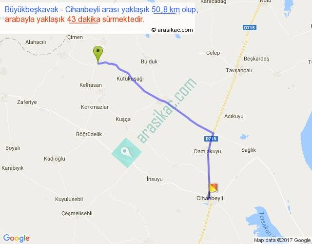 Büyükbeşkavak - Cihanbeyli arası yaklaşık olarak 90 km/h ile yukarıda belirtilen sürede olup, iki yerin kuş uçuşu uzaklığı (mesafesi) 42'dir. Yolculuk otobüsle 55 dakika sürmektedir.