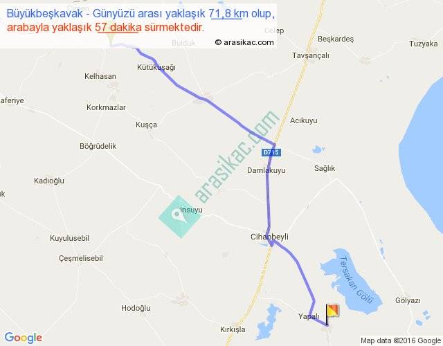 Büyükbeşkavak - Günyüzü arası yaklaşık olarak 90 km/h ile yukarıda belirtilen sürede olup, iki yerin kuş uçuşu uzaklığı (mesafesi) 60'dir. Yolculuk otobüsle 1 saat 14 dakika sürmektedir.