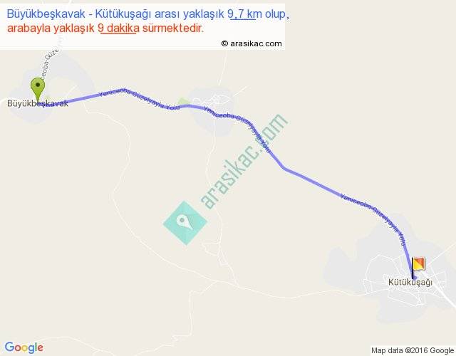 Büyükbeşkavak - Kütükuşağı arası yaklaşık olarak 90 km/h ile yukarıda belirtilen sürede olup, iki yerin kuş uçuşu uzaklığı (mesafesi) 9'dir. Yolculuk otobüsle 11 dakika sürmektedir.