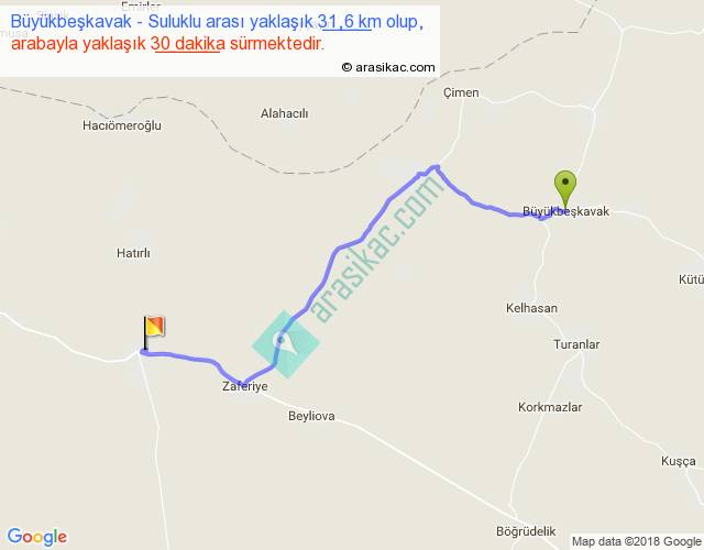 Büyükbeşkavak - Suluklu arası yaklaşık olarak 90 km/h ile yukarıda belirtilen sürede olup, iki yerin kuş uçuşu uzaklığı (mesafesi) 24'dir. Yolculuk otobüsle 39 dakika sürmektedir.