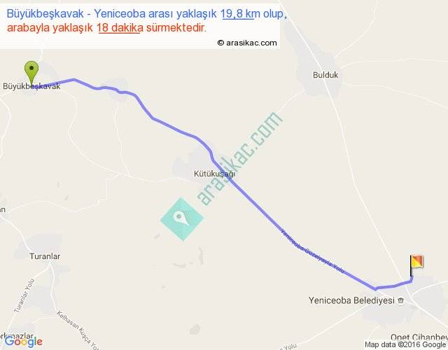 Büyükbeşkavak - Yeniceoba arası yaklaşık olarak 90 km/h ile yukarıda belirtilen sürede olup, iki yerin kuş uçuşu uzaklığı (mesafesi) 18'dir. Yolculuk otobüsle 23 dakika sürmektedir.