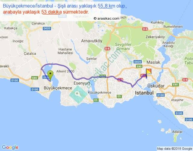 Büyükçekmece İstanbul - Şişli arası yaklaşık olarak 90 km/h ile yukarıda belirtilen sürede olup, iki yerin kuş uçuşu uzaklığı (mesafesi) 37'dir. Yolculuk otobüsle 1 saat 8 dakika sürmektedir.