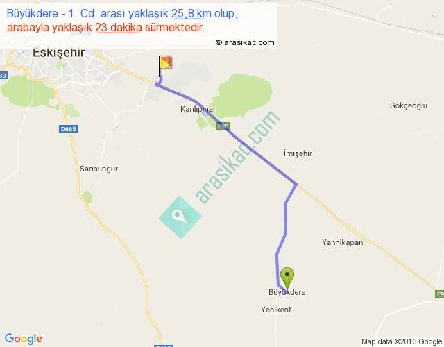 Büyükdere - 1. Cd. arası yaklaşık olarak 90 km/h ile yukarıda belirtilen sürede olup, iki yerin kuş uçuşu uzaklığı (mesafesi) 21'dir. Yolculuk otobüsle 29 dakika sürmektedir.