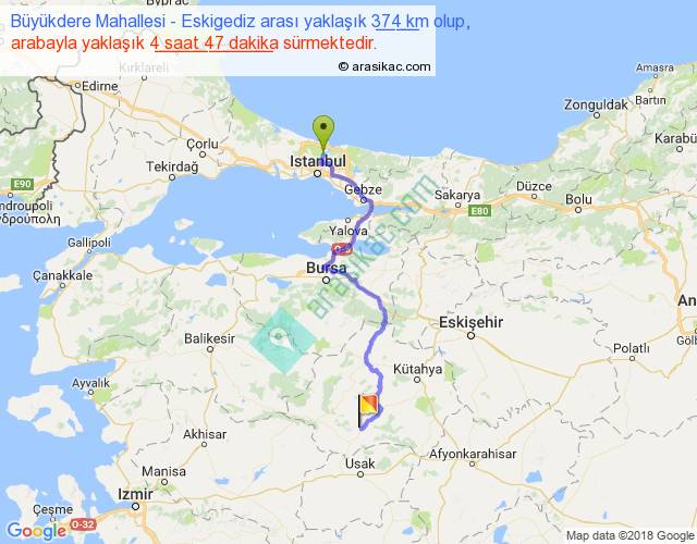 Büyükdere Mahallesi - Eskigediz arası yaklaşık olarak 90 km/h ile yukarıda belirtilen sürede olup, iki yerin kuş uçuşu uzaklığı (mesafesi) 236'dir. Yolculuk otobüsle 6 saat 13 dakika sürmektedir.