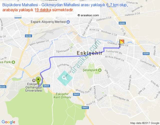 Büyükdere Mahallesi - Gökmeydan Mahallesi arası yaklaşık olarak 90 km/h ile yukarıda belirtilen sürede olup, iki yerin kuş uçuşu uzaklığı (mesafesi) 5'dir. Yolculuk otobüsle 24 dakika sürmektedir.