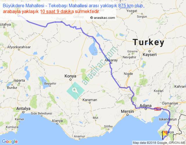 Büyükdere Mahallesi - Tekebaşı Mahallesi arası yaklaşık olarak 90 km/h ile yukarıda belirtilen sürede olup, iki yerin kuş uçuşu uzaklığı (mesafesi) 629'dir. Eğer belirtilen yerler arasında uçak seferi var ise bu süre uçakla 58 dakika'ya kadar düşebilir. Yolculuk otobüsle 13 saat 11 dakika sürmektedir.