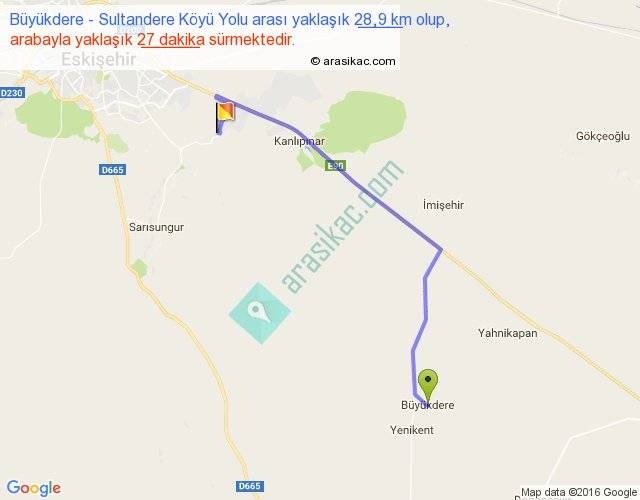Büyükdere - Sultandere Köyü Yolu arası yaklaşık olarak 90 km/h ile yukarıda belirtilen sürede olup, iki yerin kuş uçuşu uzaklığı (mesafesi) 20'dir. Yolculuk otobüsle 35 dakika sürmektedir.