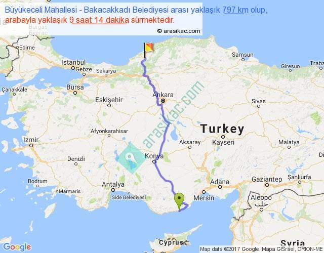 Büyükeceli Mahallesi - Bakacakkadı Belediyesi arası yaklaşık olarak 90 km/h ile yukarıda belirtilen sürede olup, iki yerin kuş uçuşu uzaklığı (mesafesi) 585'dir. Eğer belirtilen yerler arasında uçak seferi var ise bu süre uçakla 54 dakika'ya kadar düşebilir. Yolculuk otobüsle 12 saat 0 dakika sürmektedir.