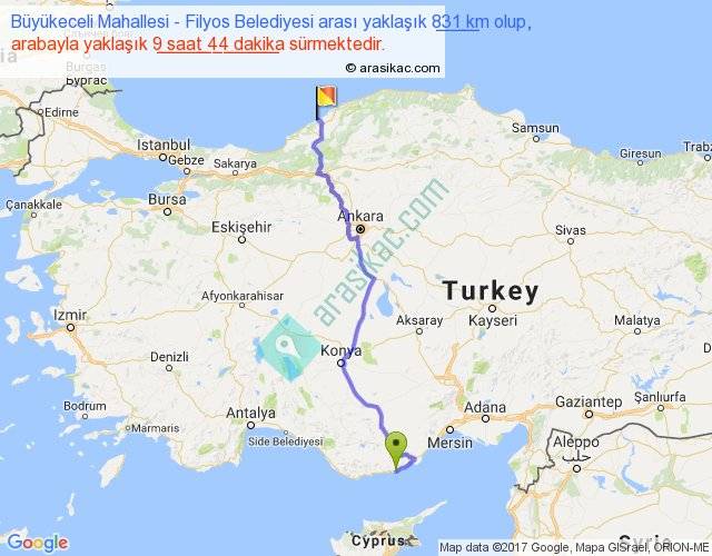 Büyükeceli Mahallesi - Filyos Belediyesi arası yaklaşık olarak 90 km/h ile yukarıda belirtilen sürede olup, iki yerin kuş uçuşu uzaklığı (mesafesi) 611'dir. Eğer belirtilen yerler arasında uçak seferi var ise bu süre uçakla 56 dakika'ya kadar düşebilir. Yolculuk otobüsle 12 saat 39 dakika sürmektedir.