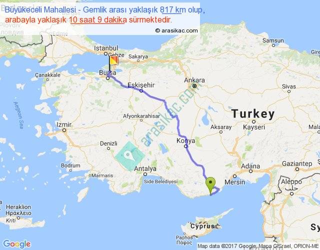 Büyükeceli Mahallesi - Gemlik arası yaklaşık olarak 90 km/h ile yukarıda belirtilen sürede olup, iki yerin kuş uçuşu uzaklığı (mesafesi) 607'dir. Eğer belirtilen yerler arasında uçak seferi var ise bu süre uçakla 56 dakika'ya kadar düşebilir. Yolculuk otobüsle 13 saat 11 dakika sürmektedir.