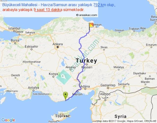 Büyükeceli Mahallesi - Havza Samsun arası yaklaşık olarak 90 km/h ile yukarıda belirtilen sürede olup, iki yerin kuş uçuşu uzaklığı (mesafesi) 573'dir. Eğer belirtilen yerler arasında uçak seferi var ise bu süre uçakla 52 dakika'ya kadar düşebilir. Yolculuk otobüsle 11 saat 58 dakika sürmektedir.