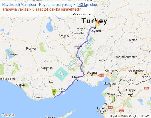 Büyükeceli Mahallesi - Kayseri arası yaklaşık olarak 90 km/h ile yukarıda belirtilen sürede olup, iki yerin kuş uçuşu uzaklığı (mesafesi) 329'dir. Eğer belirtilen yerler arasında uçak seferi var ise bu süre uçakla 30 dakika'ya kadar düşebilir. Yolculuk otobüsle 7 saat 1 dakika sürmektedir.