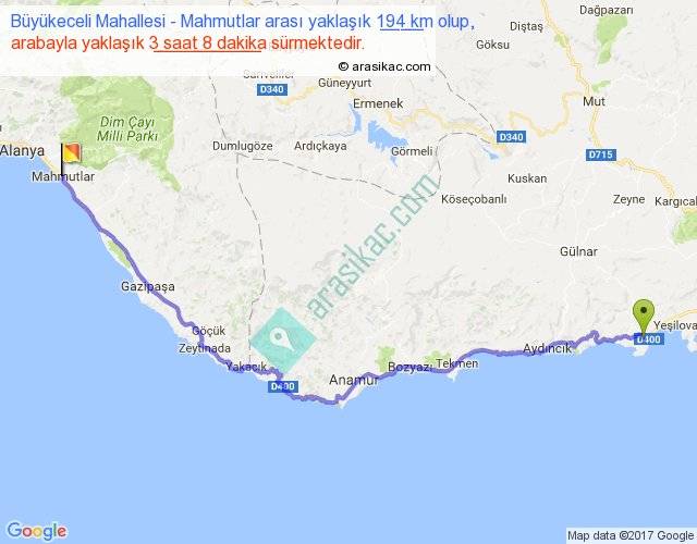 Büyükeceli Mahallesi - Mahmutlar arası yaklaşık olarak 90 km/h ile yukarıda belirtilen sürede olup, iki yerin kuş uçuşu uzaklığı (mesafesi) 136'dir. Yolculuk otobüsle 4 saat 4 dakika sürmektedir.
