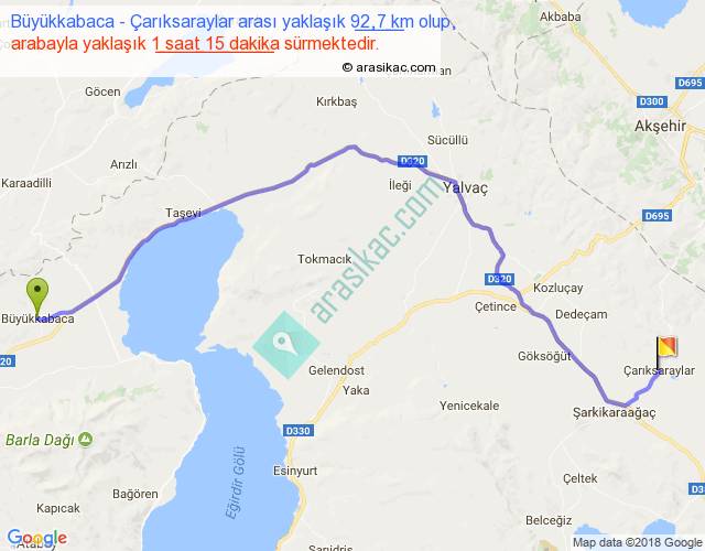 Büyükkabaca - Çarıksaraylar arası yaklaşık olarak 90 km/h ile yukarıda belirtilen sürede olup, iki yerin kuş uçuşu uzaklığı (mesafesi) 68'dir. Yolculuk otobüsle 1 saat 37 dakika sürmektedir.