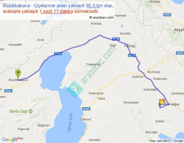 Büyükkabaca - Çiçekpınar arası yaklaşık olarak 90 km/h ile yukarıda belirtilen sürede olup, iki yerin kuş uçuşu uzaklığı (mesafesi) 60'dir. Yolculuk otobüsle 1 saat 32 dakika sürmektedir.
