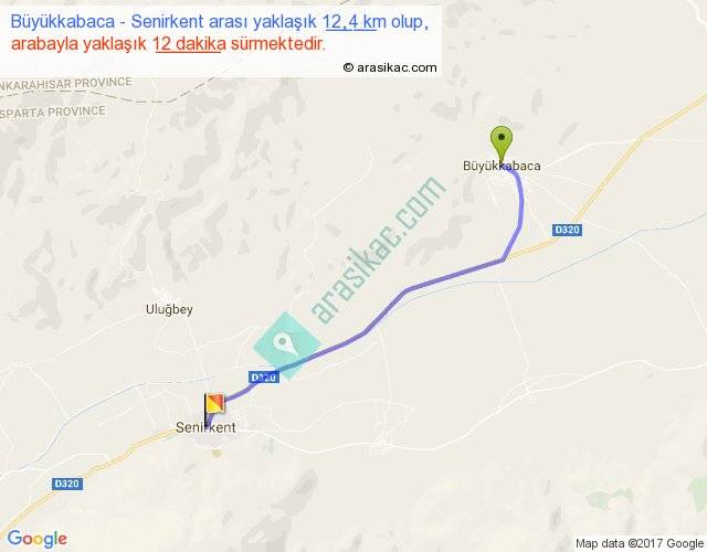 Büyükkabaca - Senirkent arası yaklaşık olarak 90 km/h ile yukarıda belirtilen sürede olup, iki yerin kuş uçuşu uzaklığı (mesafesi) 11'dir. Yolculuk otobüsle 15 dakika sürmektedir.