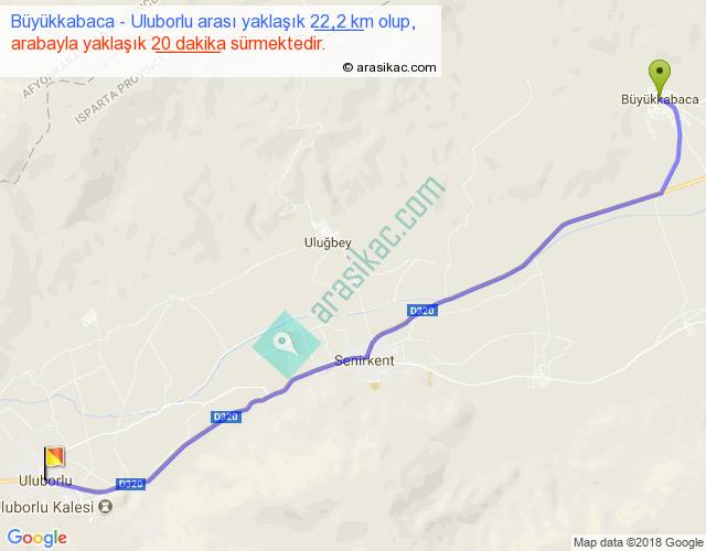Büyükkabaca - Uluborlu arası yaklaşık olarak 90 km/h ile yukarıda belirtilen sürede olup, iki yerin kuş uçuşu uzaklığı (mesafesi) 20'dir. Yolculuk otobüsle 26 dakika sürmektedir.